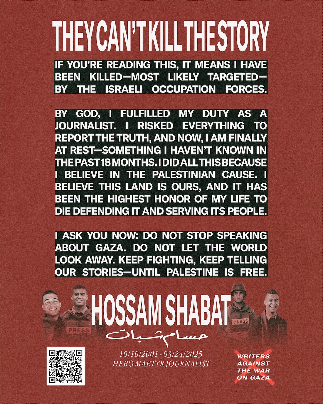 “By God, I fulfilled my duty as a journalist. I risked everything to report the truth, and now, I am finally at rest—something I haven’t known in the past 18 months. I did all this because I believe in the Palestinian cause. I believe this land is ours, and it has been the highest honor of my life to die defending it and serving its people.”