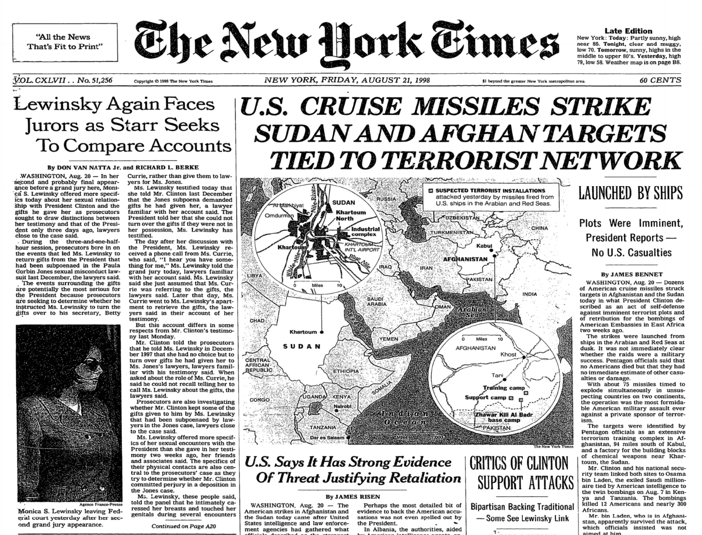 The next-day front page headline, in all caps, read: “U.S. CRUISE MISSILES STRIKE SUDAN AND AFGHAN TARGETS TIED TO TERRORIST NETWORK.”