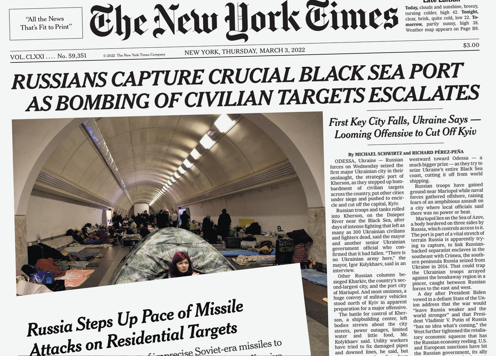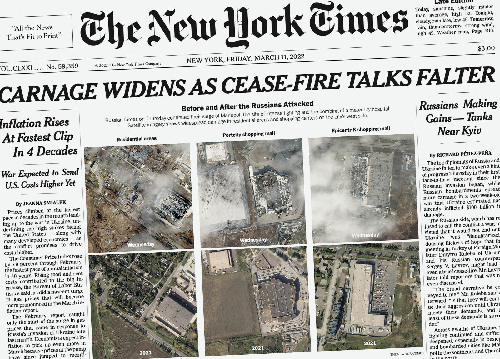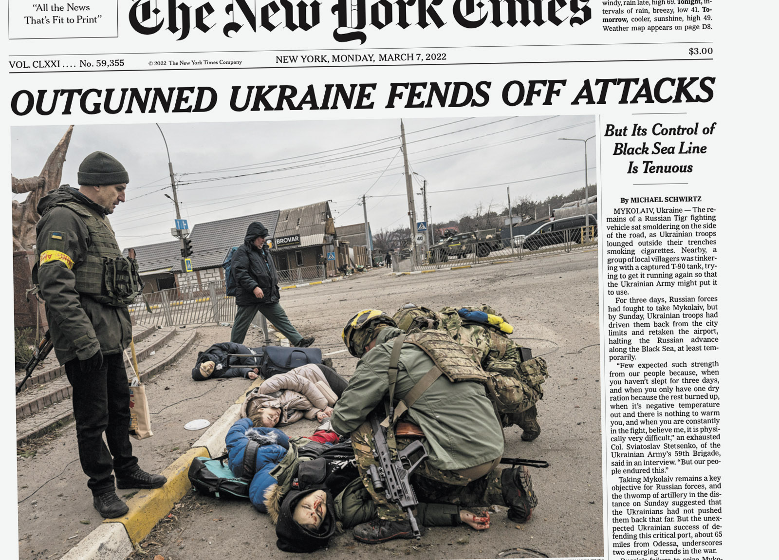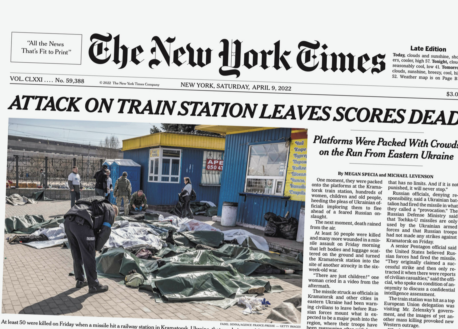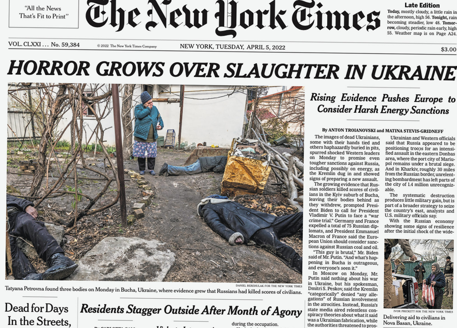 “CARNAGE WIDENS AS CEASEFIRE TALKS FALTER” was the front-page headline on March 11, 2022, accompanied by six aerial photos showing Russia’s invasion of Ukraine. On April 5 after Russian forces withdrew from the Kyiv suburb of Bucha, leaving behind dozens of corpses, the front page read, “HORROR GROWS OVER SLAUGHTER IN UKRAINE.”
