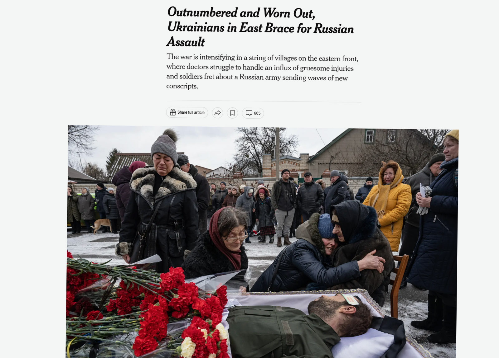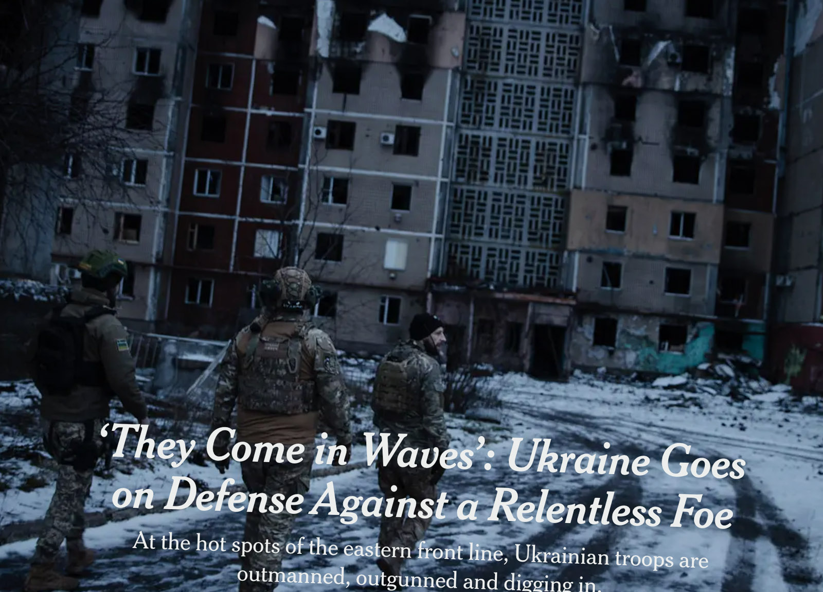 Another long-form report, “‘They Come in Waves’: Ukraine Goes on Defense Against a Relentless Foe” from February of this year, as Western aid threatened to dry up, once again makes an implicit case for military aid, from the sub-head, “Ukrainian troops are outmanned, outgunned and digging in,” to the article itself: