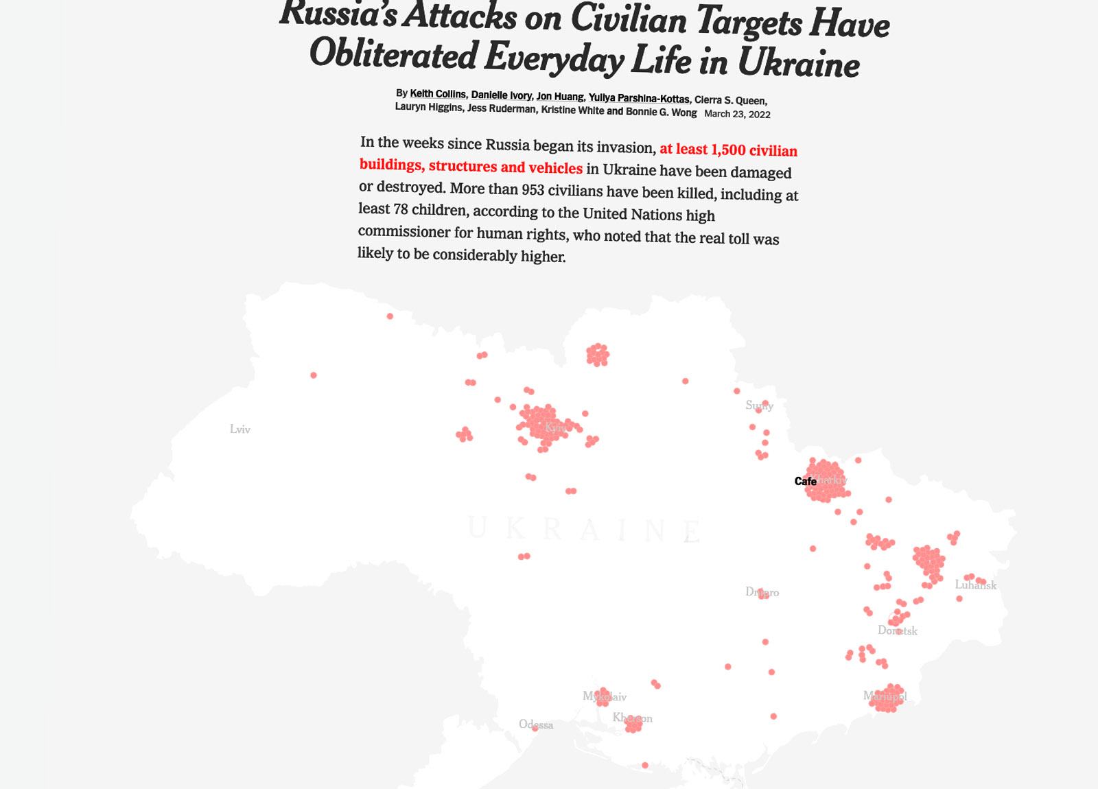 About a month into Russia’s invasion, The Times exhaustively mapped out each and every Russian attack on civilian infrastructure and residential areas in Ukraine, arguing that “Russia’s Attacks on Civilian Targets Have Obliterated Everyday Life in Ukraine.”