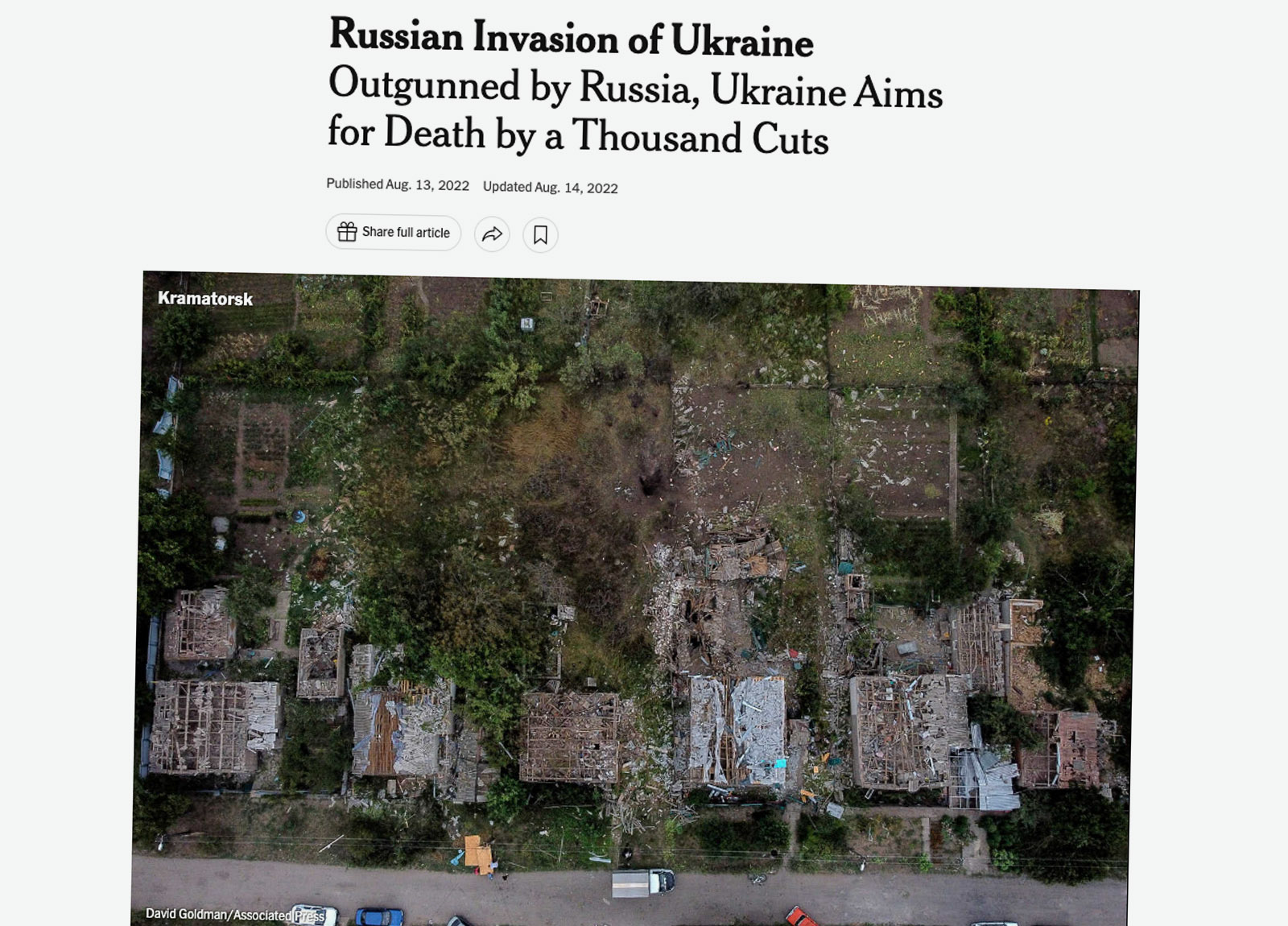 Ukraine is always framed as the David of the story, “outgunned,” “scrappy,” and fighting on despite its disadvantages. We find paragraph constructions like this, from a June 2022 story, “An outgunned Ukraine is adding to the pressure on Europe,” in seemingly straightforward war reporting: