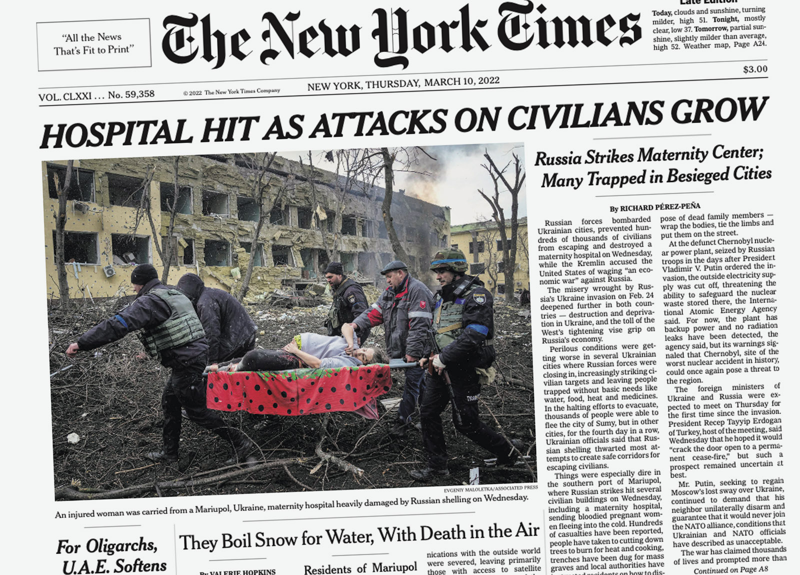 “A Russian strike hit a hospital in Mariupol, a southern Ukrainian city near the Russian border. The complex included a children’s clinic and a maternity ward. Video showed blown-out windows in the hospital and a crater, more than 10 feet deep, in a courtyard . . . It was another apparent instance of Russia’s efforts to destroy civilian infrastructure in Mariupol.”