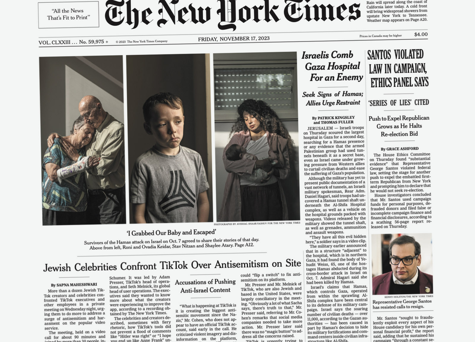 On The Times’ Nov. 12 front page [left], Hamas’ Oct. 7 attack is described as a “slaughterhouse” while directly below, the IDF’s attack on Al-Shifa is portrayed in dry, equivocating language which legitimizes Israel’s excuses for assaulting the largest hospital in Gaza. On its Nov. 17 front page, The Times printed humanizing portraits of victims of the Oct. 7 attack alongside a story on the rise of their version of anti-semitism (which is quickly revealed to be a standard Times conflation with anti-Zionism), while the IDF’s ongoing attack on al-Shifa is described in legitimizing language: “Israelis Comb Gaza Hospital for an Enemy.” This usage of space forces a perspective that minimizes Israeli war crimes and maximizes depictions of Israeli suffering – disappearing Palestinians from view.