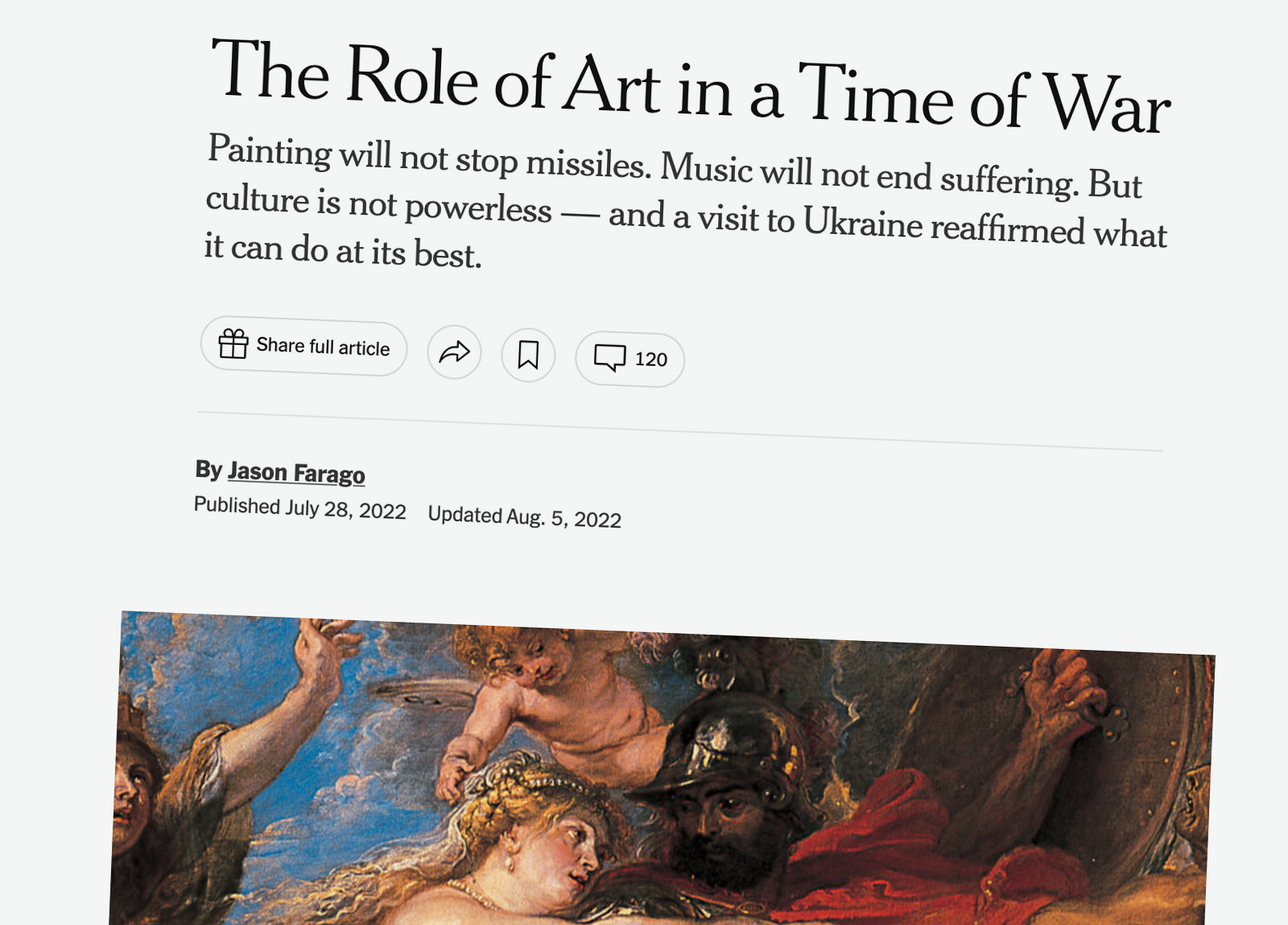 The Times wrote features on Ukrainian techno collectives, resistance to Russification, the “decolonization” of Ukrainian art, resilient theater groups and the preservation of art in wartime. Meanwhile, its culture critics assessed “The Role of Art in a Time of War,” writing authoratatively in the lede: “You do not have to go far outside of Kyiv to see how the massacre of civilians and the trampling of culture still come one after the other.” Another headline declared “The War in Ukraine Is the True Culture War,” as the author definitively describes the Russian assault on Ukrainian culture: